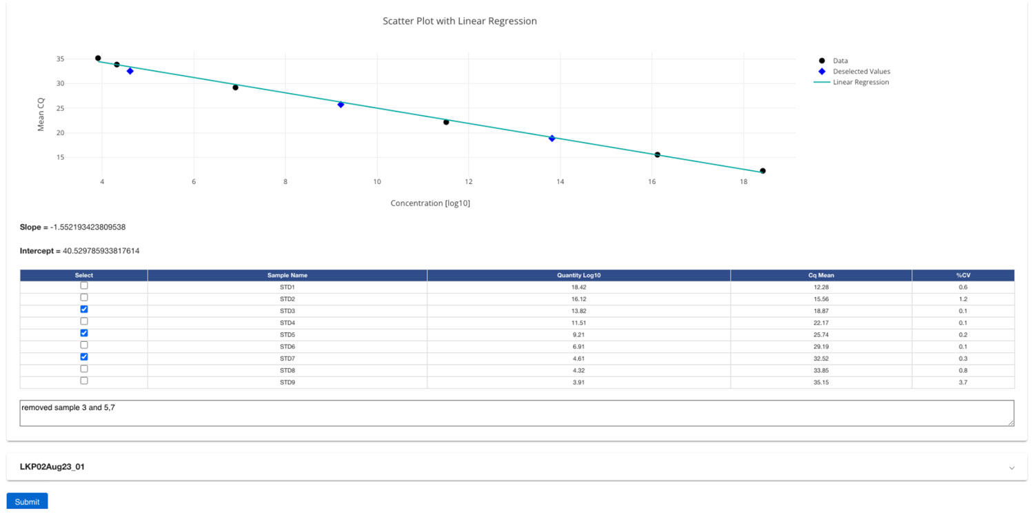 Red Thread Script, part of the Red Thread solution, automates tabulation of data from raw data obtained from instruments, performs critical statistical calculations such as mean and %CV, while applying user-defined acceptance criteria to annotate results with consistency and accuracy. It also derives best-fit line equations and enables real-time, interactive data interpolation, supporting objective decision-making and minimizing reliance on manual interpretation.
